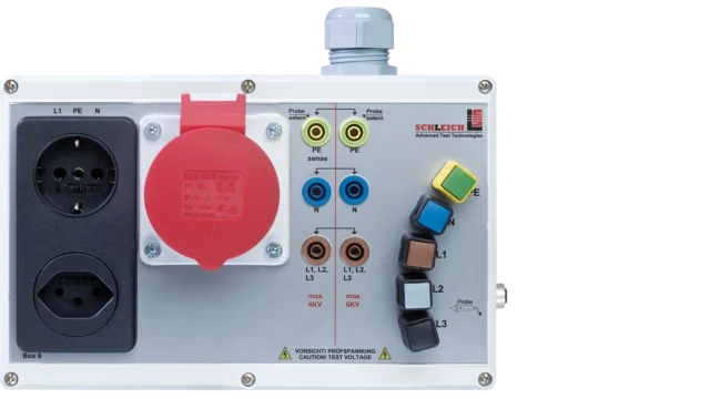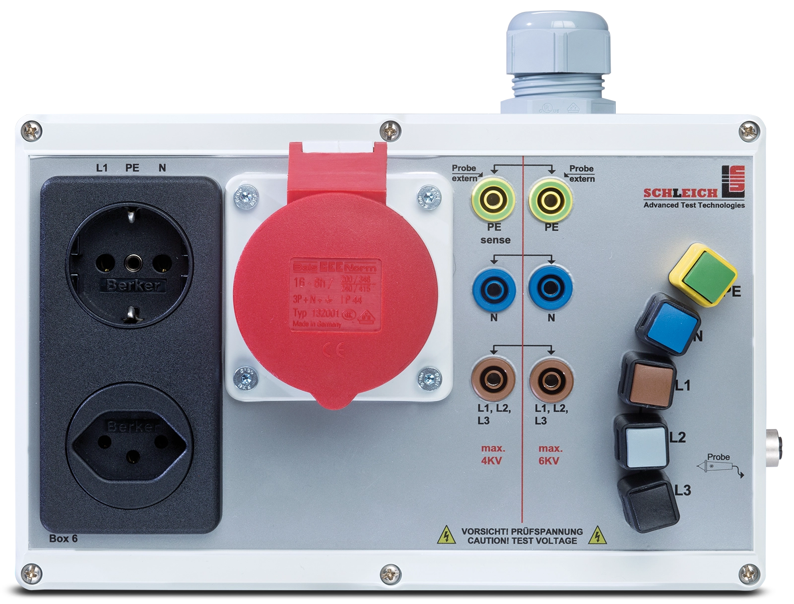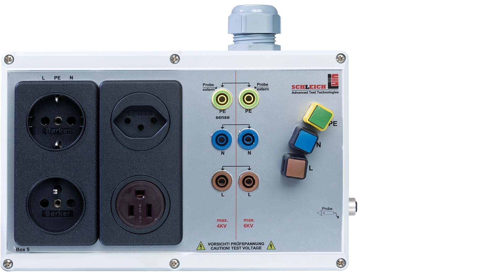 Many test objects can be connected via a power plug, which the operator plugs into the test socket of the connection box. The various test sockets are equipped according to individual requirements on an order-by-order basis.