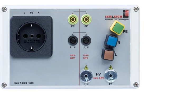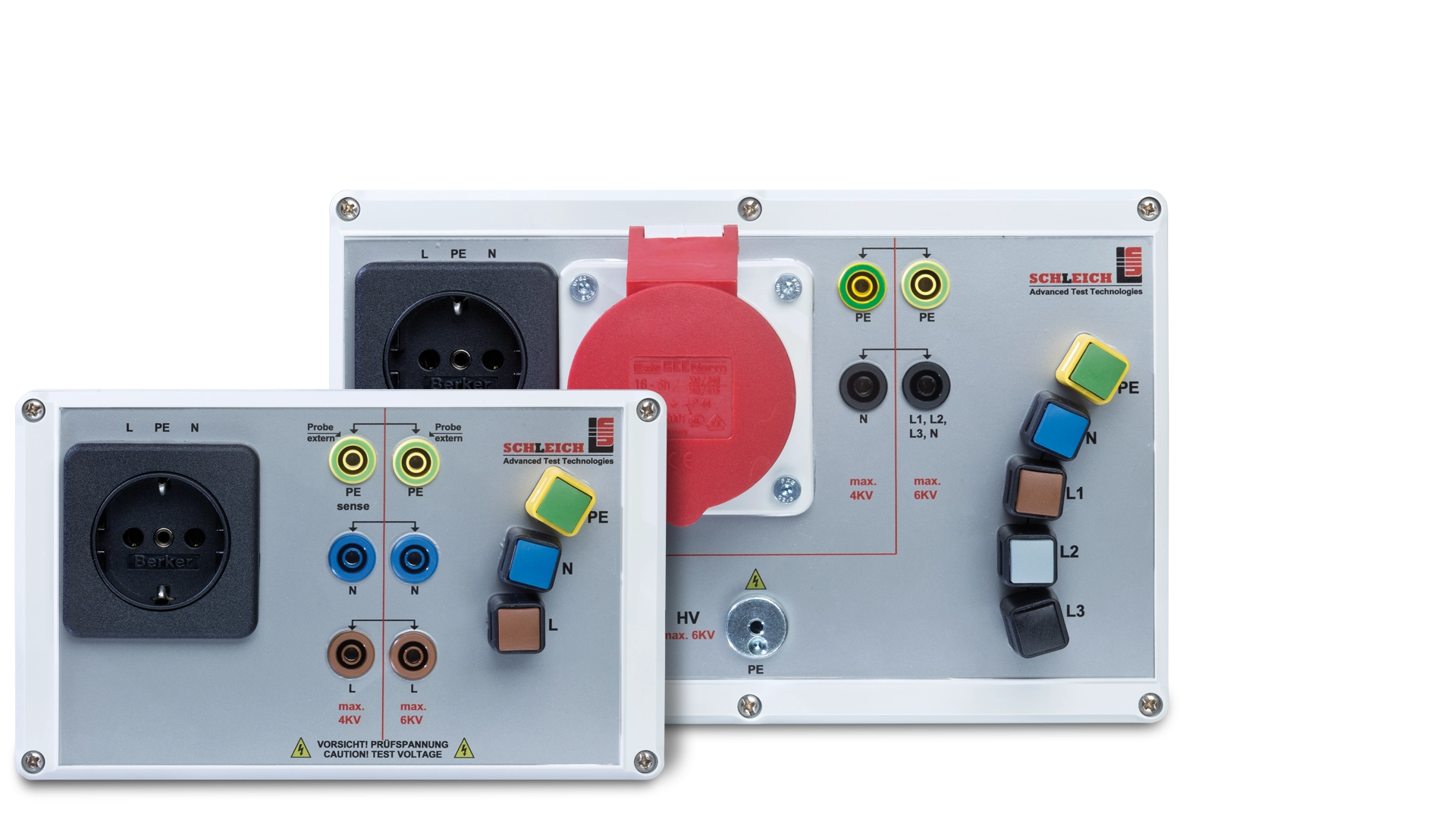 Da einige länderspezifische Prüfsteckdosen nicht für die volle Hochspannung von 6 kV geeignet sind, können die Prüfsteckdosen über Brückenstecker getrennt werden. Darüberhinaus liefert SCHLEICH auch speziell hergestellte hochspannungsfeste Spezialprüfsteckdosen bis 6 kV.