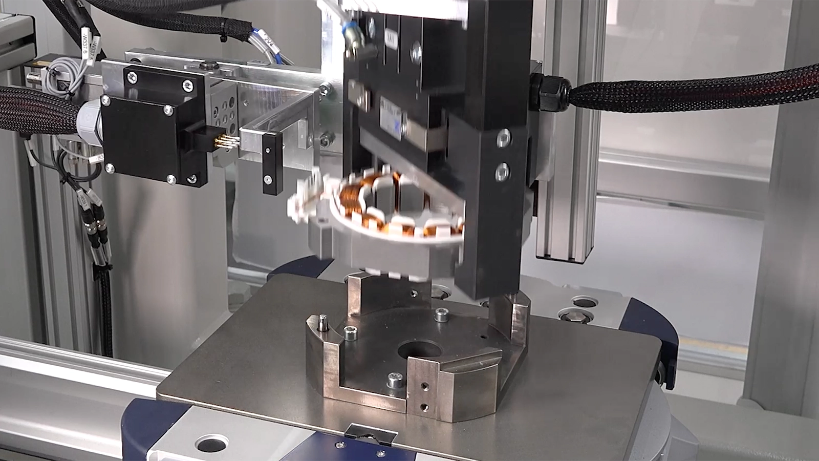 The single-component impregnating resin is automatically filled into the winding using integrated pump technology. The filling quantity, filling time, and impregnation temperature can be freely preselected. The resin begins to gel on the winding.
