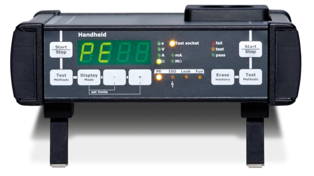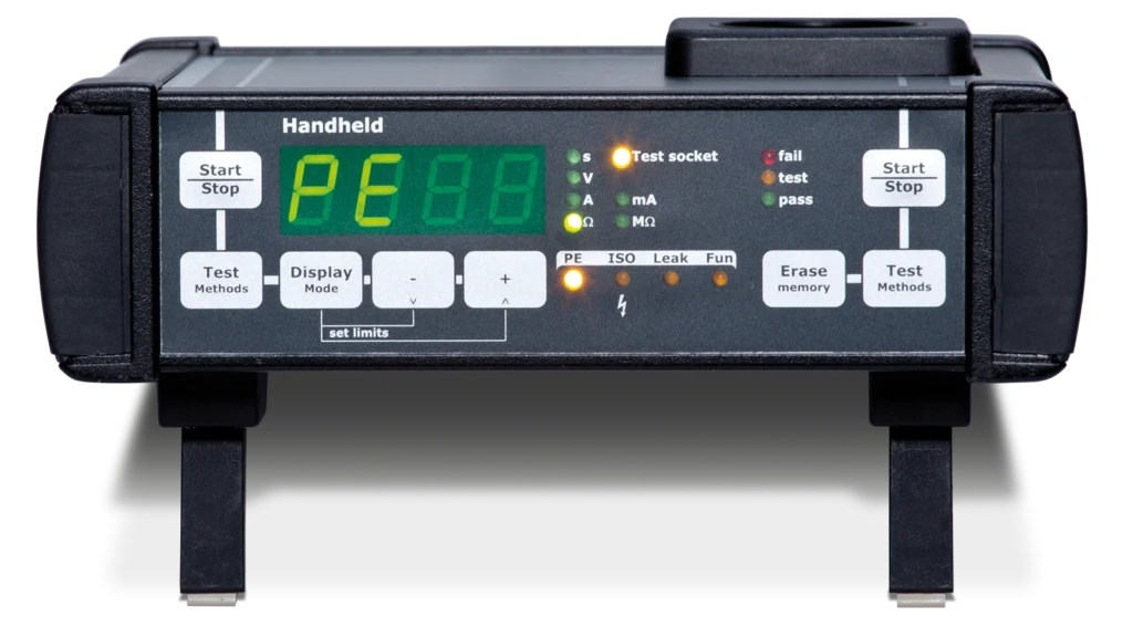 El HandHeld es su especialista en pruebas de resistencia de aislamiento y conductor de protección conformes con las normas. Gracias a su diseño pequeño y robusto, puede realizar pruebas de seguridad de manera eficiente no solo en el taller y la producción, sino también de manera flexible y móvil in situ, lo que lo hace ideal para reparaciones, montajes y servicios de mantenimiento en las instalaciones del cliente.
