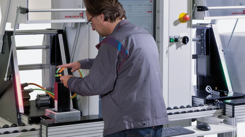 Nous fournissons des systèmes de contrôle comprenant l'appareil de contrôle, le contact avec l'objet à contrôler et l'automatisation mécanique complète. Tout est clé en main et provient d'un seul et même fournisseur. Tous les composants d'automatisation sont SCHLEICH , conçus, fabriqués, montés et mis en service par la société SCHLEICH .