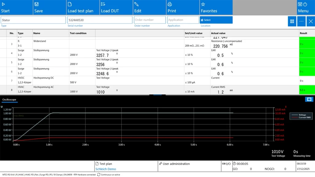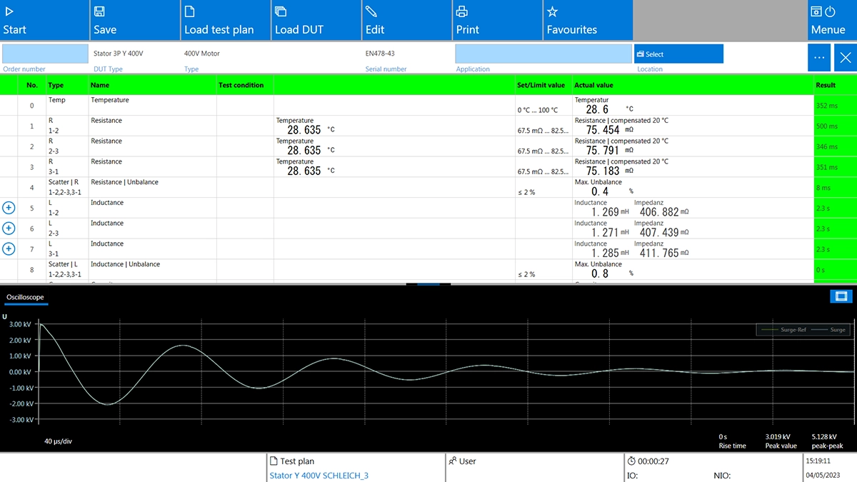 Nos systèmes de test MTC3 entièrement automatisés Test bobinagestest de surtension et rapide afin de détecter d'éventuels défauts d'isolation grâce autest de surtension brevetétest de surtension . Une fois Appareil testé connecté, le test se déroule avec commutation automatique commutation connexions et commutation méthodes de test. Le MTC3 Étape de test chaque Étape de test prédéfinie. À la fin du processus de test, vous obtenez unrésultat clair et reproductible : bon ourésultat.