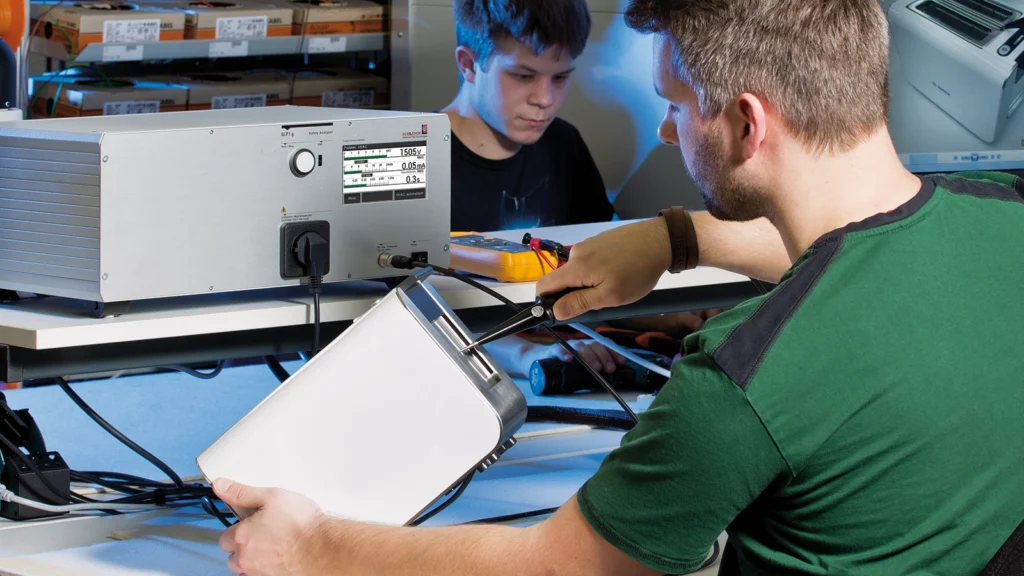 Per gli stabilimenti di produzione offrire più offrire gli apparecchi di prova dell'isolamento parzialmente o completamente automatizzati. Questi sono dotati di un pannello di commutazione a relè (matrice a relè) che commuta TENSIONE DI PROVA la TENSIONE DI PROVA sui punti di prova desiderati. La prova manuale viene eseguita con una sonda di prova. A tal fine, l'operatore sposta manualmente la sonda di prova da un punto di prova all'altro. Nonostante la procedura manuale, il test può essere documentato in modo impeccabile. Un'applicazione tipica è il controllo di prodotti elettrici, quadri elettrici e macchine secondo la direttiva macchine EN 60204.