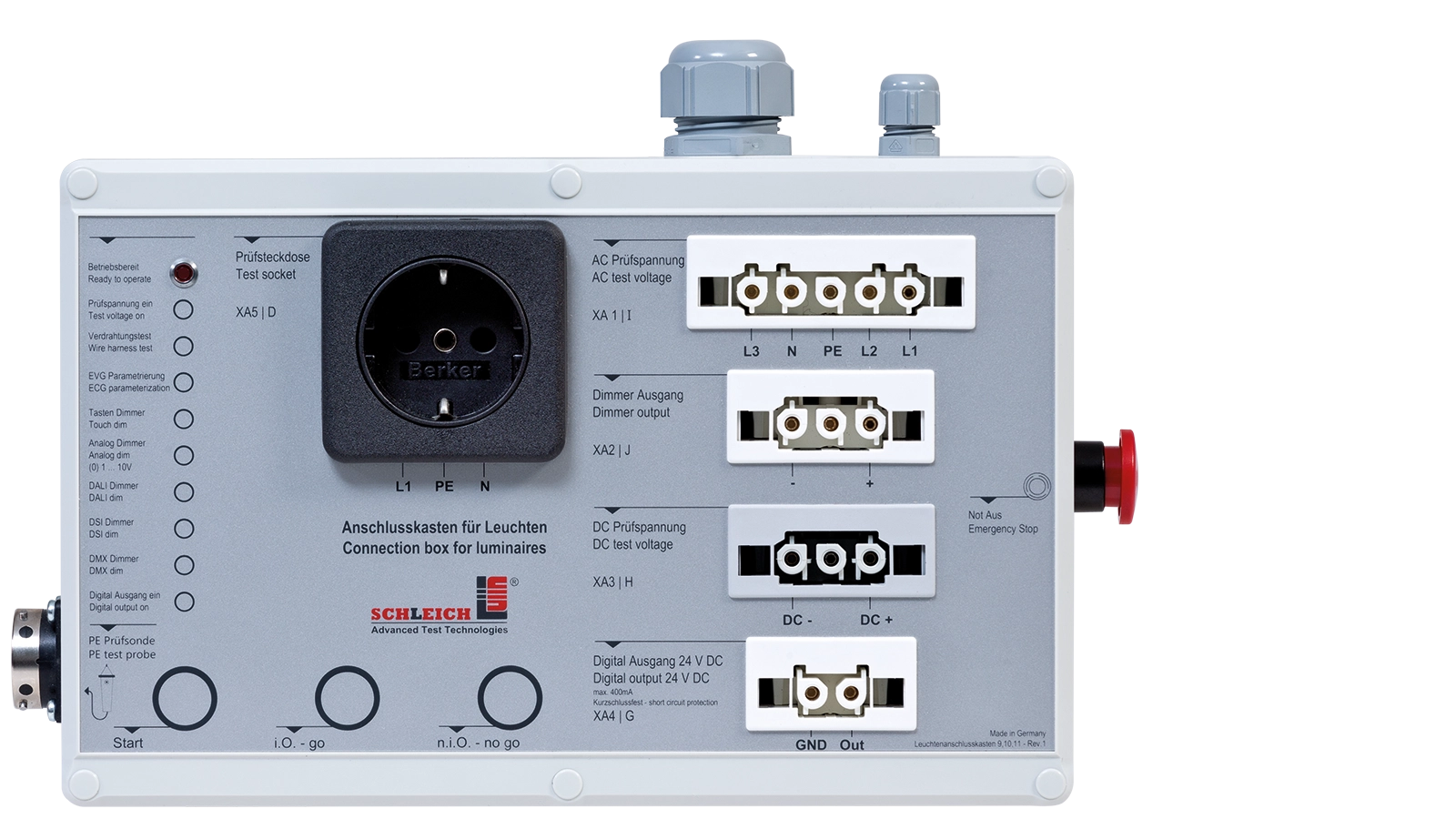 Do testowania opraw oświetleniowych GLP2-MODULAR zazwyczaj urządzenia testujące klasy GLP2-BASIC GLP2-MODULAR . Urządzenia te posiadają z tyłu gniazdo testowe. Podłącza się do niego inteligentny comBOX. Łączy się on automatycznie poprzez Plug & Play w celu komunikacji z urządzeniem testującym. Ze strony użytkownika nie są konieczne żadne dodatkowe prace konfiguracyjne. Dzięki temu późniejsze doposażenie w comBOX jest bardzo proste.