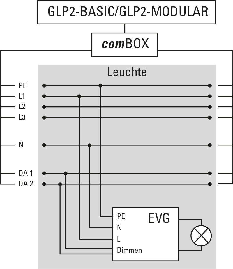 Die comBOX udostępnia do 7 przyłączy dla oprawy oświetleniowej. Służą one do zasilania napięciem sieciowym oraz komunikacji z elektronicznym statecznikiem. Ponadto dostępnych jest opcjonalnie 7 dodatkowych przyłączy, jeśli w toku test ciągłości oprawie oświetleniowej.