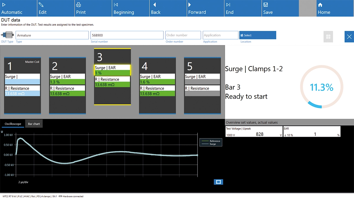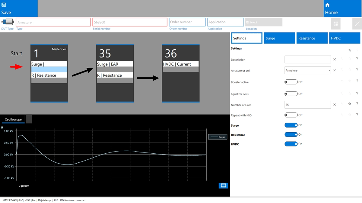 Für die MTC2 R7-Prüfgeräte ist ein zusätzlicher Ankerbooster für die Ankerprüfung erhältlich. Dieser ist für die Prüfung größerer, niederinduktiver Gleichstromanker erforderlich. Er erhöht den Stoßstrom um den Faktor 10, um Kurzschlüsse und Isolationsfehler zwischen den Lamellen zu erkennen.