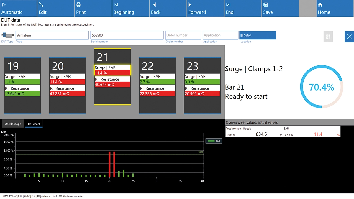 Mit dem von Ihnen für die Prüfung gewählten Lamellenabstand führen Sie nun nacheinander alle Prüfungen durch. Dies wiederholen Sie, bis Sie alle Lamellen rund um den Kommutator abgetastet haben.