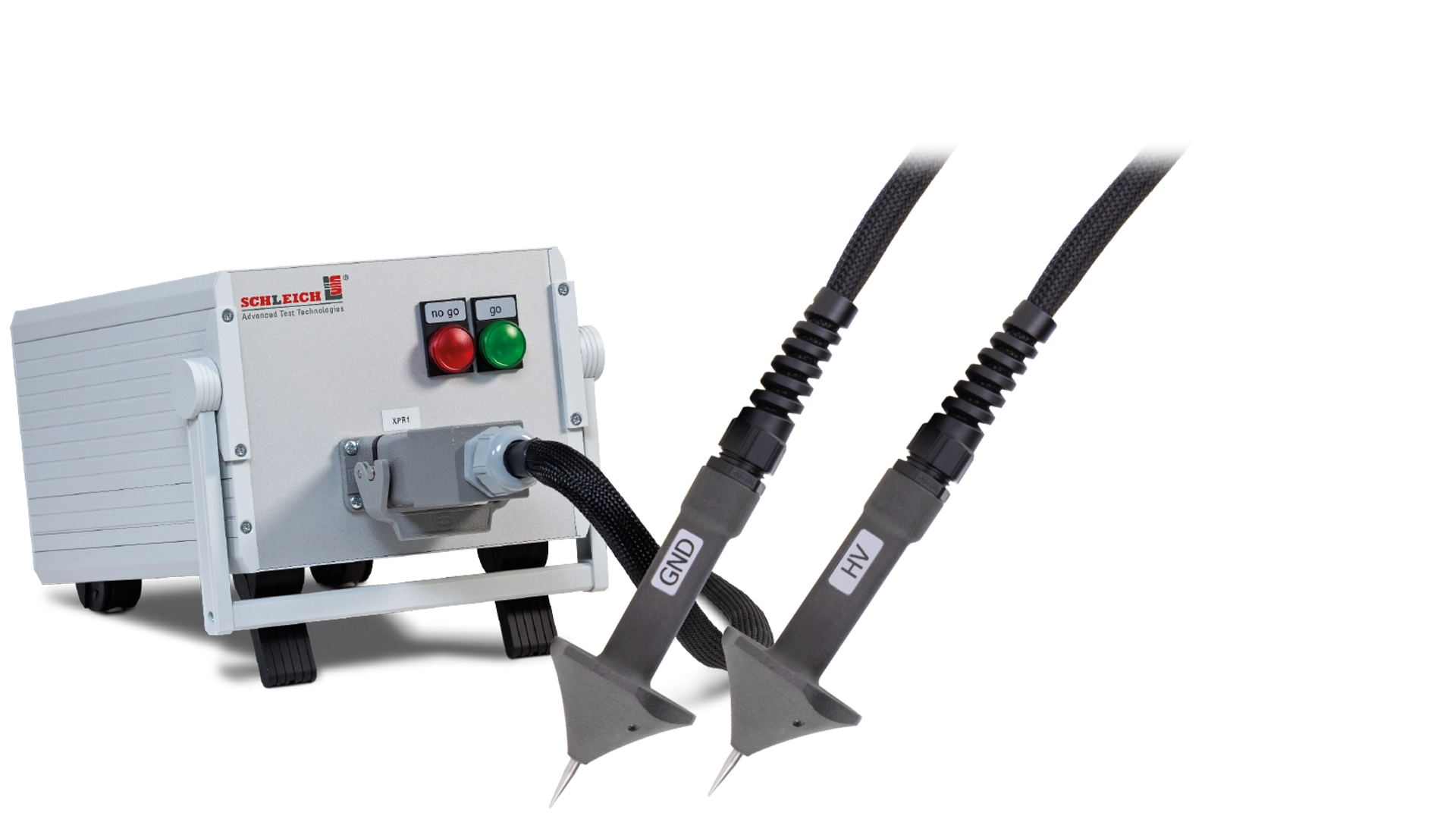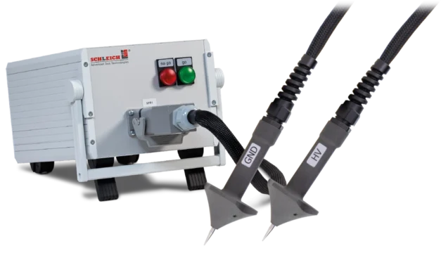 Der Ankerbooster wird an die Messleitungen des MTC2 R7 angeschlossen. Am Ausgang des Boosters stehen dem Anwender zwei solide Prüfsonden zur Verfügung. Eine integrierte Warnleuchte zeigt an, ob die Prüfspitzen spannungsfrei sind. Ein akustisches Signal gibt Auskunft darüber, ob die Prüfung i. O. oder n. i. O. ist.
