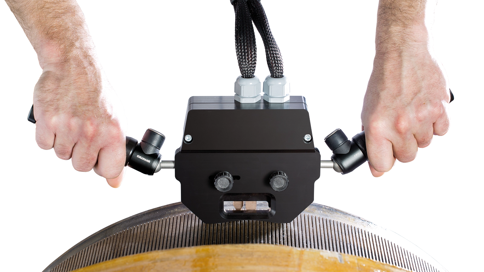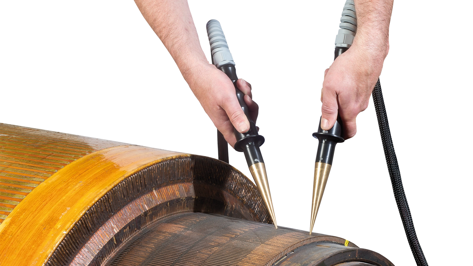Die Prüfung erfolgt mit zwei Prüfspitzen, die auf die Lamellen gedrückt werden (Lamellenmethode). Die Prüfung findet somit zwischen zwei Lamellen des Kommutators statt. Über die beiden Starttaster in den Prüfspitzen können Sie die Prüfung auslösen.