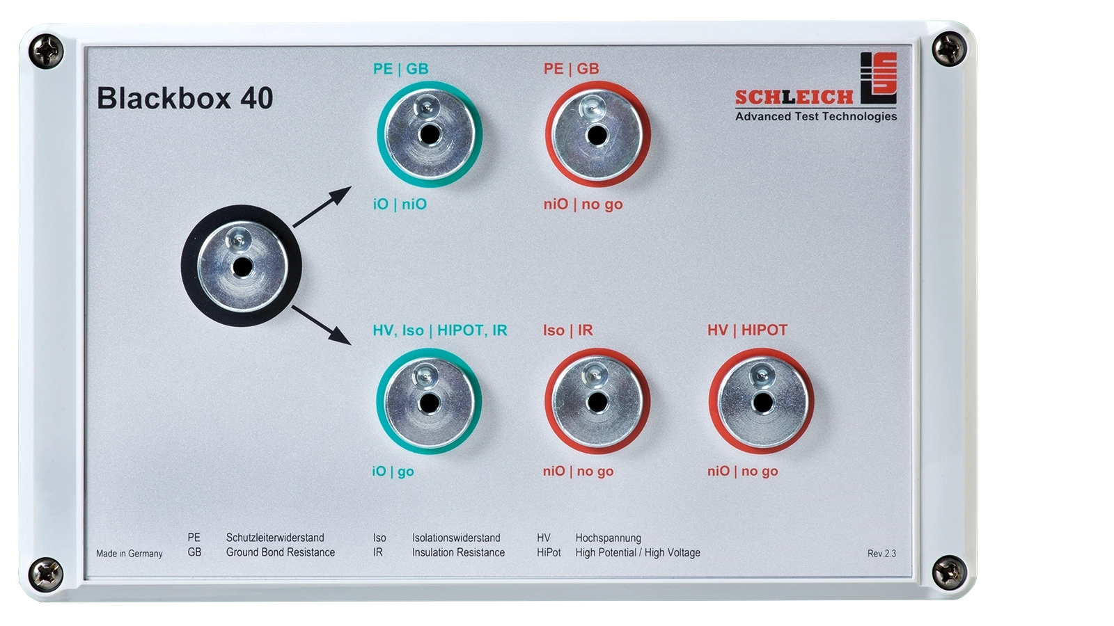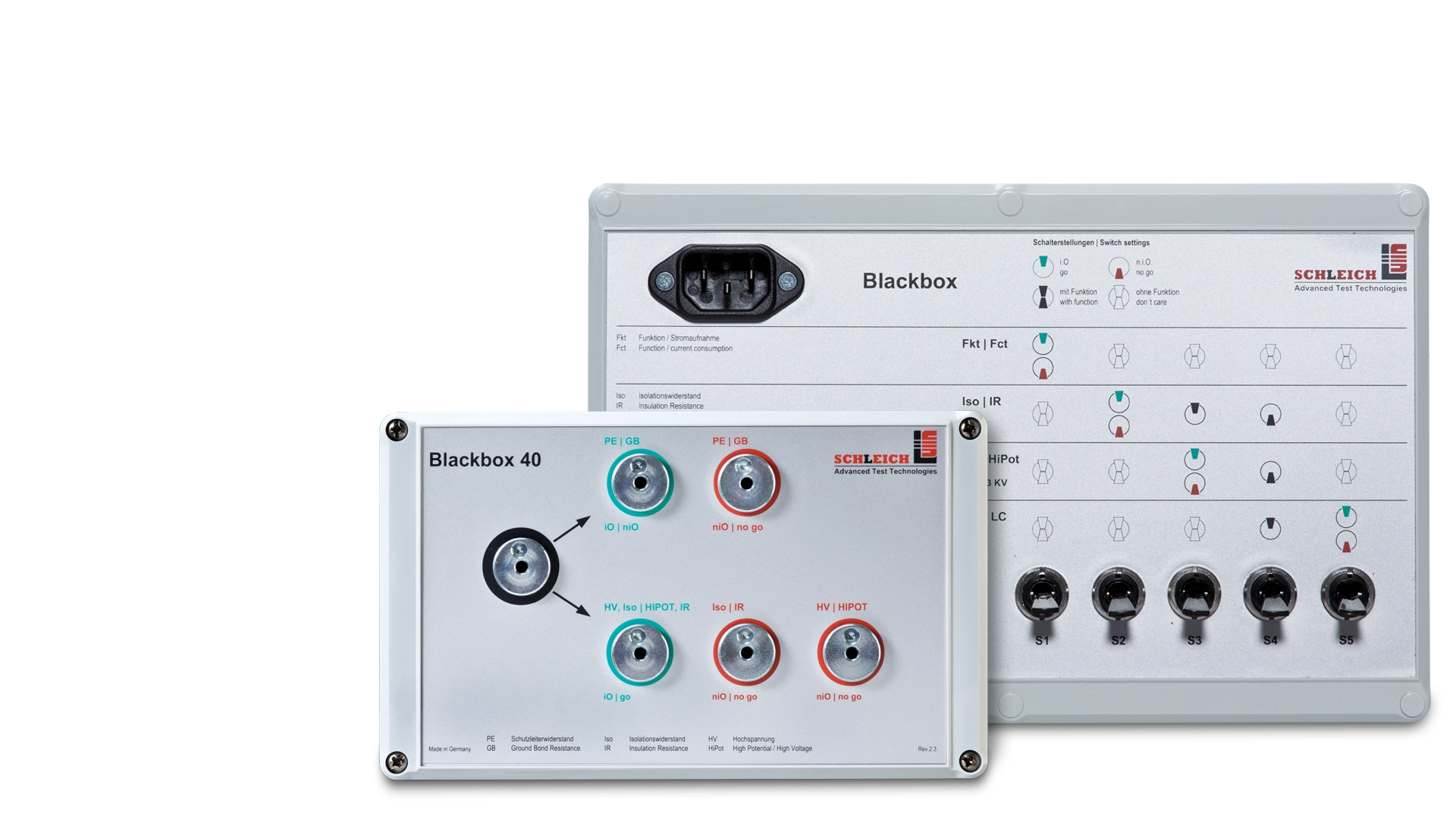 Jede Blackbox besteht aus einer Anschlussmöglichkeit zum Prüfgerät und einem oder mehreren Präzisionswiderständen und/oder Induktivitäten. Sie kann entweder für ein Prüfmethode oder für Kombinationen mehrerer Prüfmethoden ausgelegt sein.