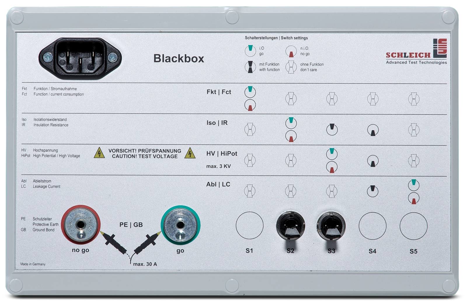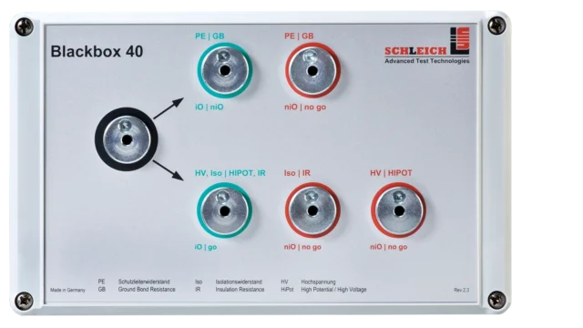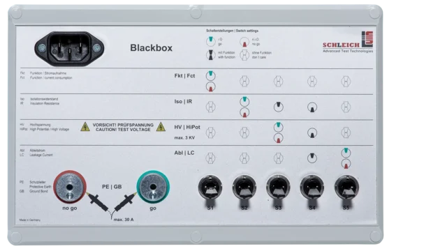 Für die tägliche regelmäßige Überprüfung des Prüfgeräts wird eine Blackbox (Prüfdummy) verwendet, die an das Prüfgerät angeschlossen wird. Es wird geprüft, ob die vom Prüfgerät ermittelten Messwerte mit den Werten der Blackbox übereinstimmen. Ist dies nicht der Fall, wird das Prüfgerät gesperrt. Die Benutzung des Gerätes wird erst wieder freigegeben, wenn ein Blackboxtest mit korrektem Ergebnis durchgeführt wurde. Da wir nur digital auswertende Prüfgeräte liefern, führen wir diesen Test in der Regel nicht mit einer „Gut/Schlecht-Blackbox“ durch, sondern verwenden nur eine Blackbox und werten die resultierenden Messwerte innerhalb enger Toleranzgrenzen aus.