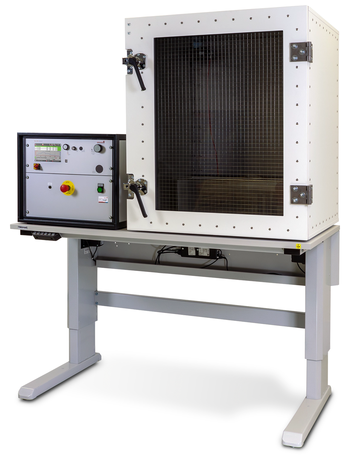 Beim Schließen drückt die Tür auf umlaufende geerdete Kontaktzungen, um den Spalt zwischen Innenraum und Außenbereich sicher abzuschließen. Für maximale Sicherheit ist die Tür mit einem 2-kanaligen Sicherheitsendschalter der Sicherheitskategorie IV ausgestattet. Dadurch kann die Prüfkabine direkt und problemlos an das Prüfgerät angeschlossen werden.