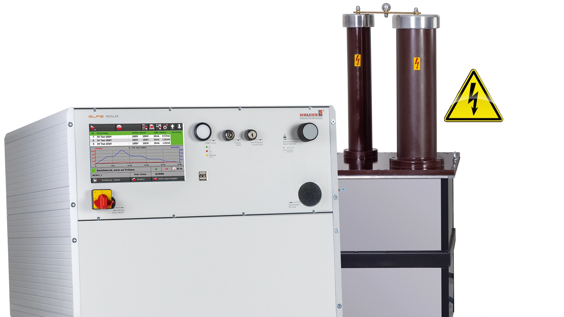 Aber auch die Bauform des Hochspannungsprüfgerätes ist im Vergleich zum normalen Laboralltag eher ungewöhnlich, denn wer möchte schon direkt neben einer 80 kV-Anlage stehen? Aus diesem einleuchtenden Grund – und oft auch aus Platzgründen – bietet sich für solche Anwendungsfälle ein Splitgerät als Bauform an.