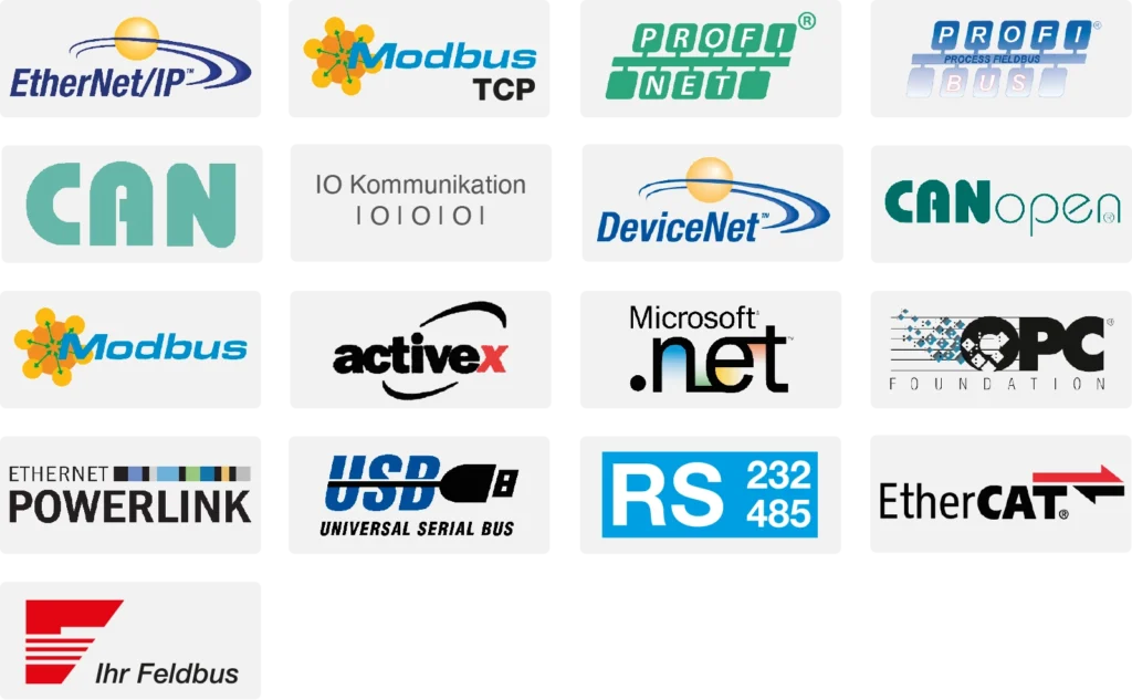 - Kommunikation mit dem Prüfobjekt: RS232, PROFIBUS, PROFINET, CAN, Ethernet, EtherCat, USB, analog, PWM, …