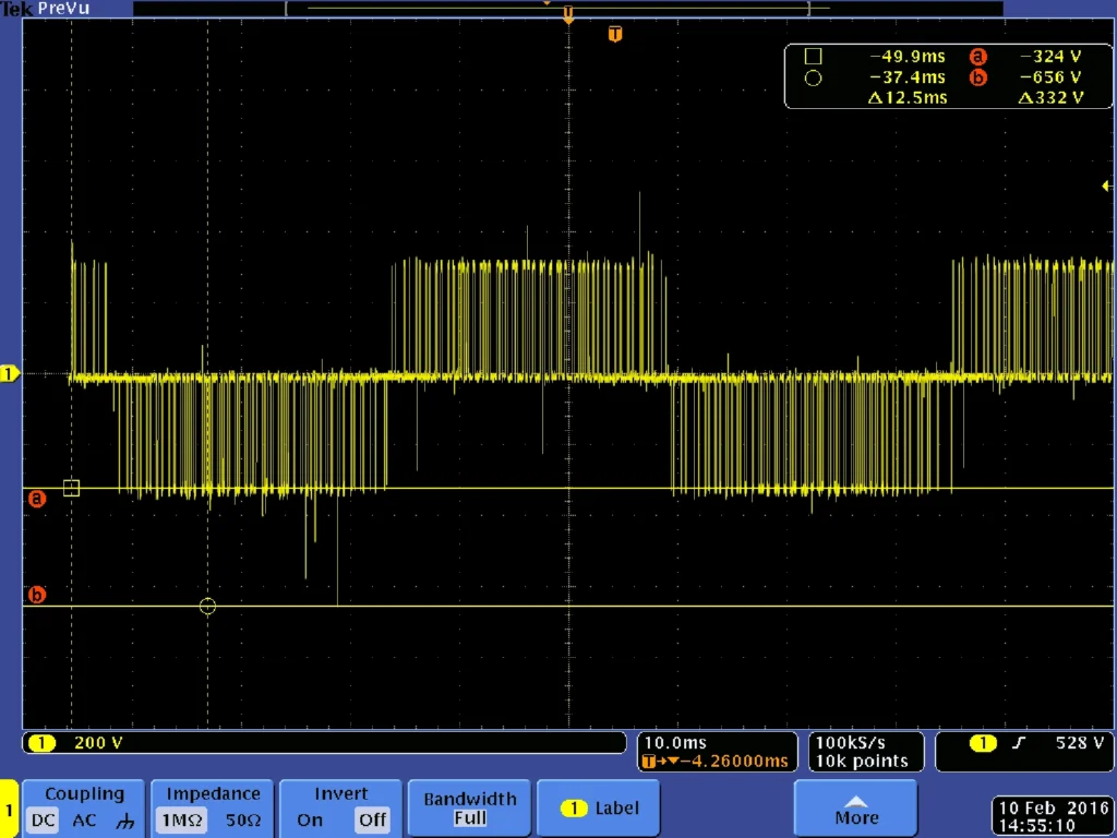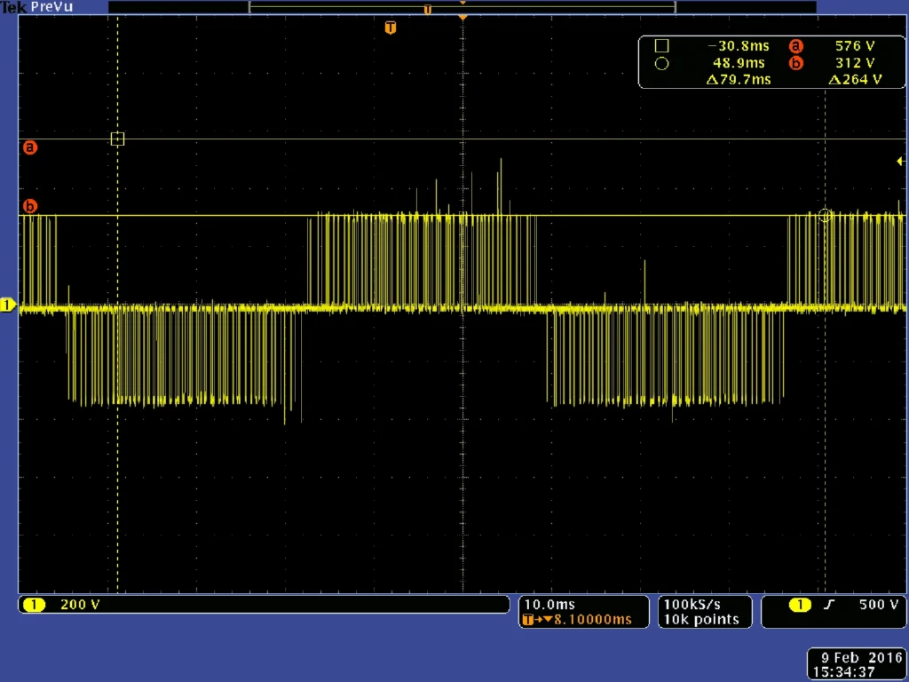 Der Spannungspegel ergibt sich aus der AC-Versorgungsspannung des Frequenzumrichters. Da jeder Frequenzumrichter die Eingangsspannung zunächst gleichrichtet, ist jeder Umrichter mit einem Gleichspannungszwischenkreis aus Kondensatoren ausgestattet, die auf die Eingangsspannung x √2 geladen sind. Für 230 V AC ergibt sich ein Wert von 320 V DC und für 400 V AC ein Wert von ca. 560 V DC. Die Abbildung zeigt einen Pegel von 315 V DC, der gut mit der 230 V AC-Versorgung übereinstimmt.