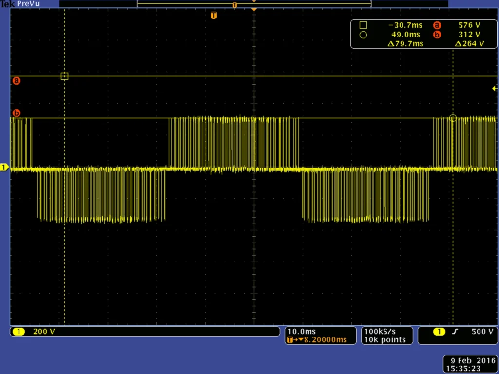 Am Frequenzumrichter-Ausgang sind die Schaltflanken noch sehr nahe an der optimalen Rechteckform. Die Abbildung zeigt die Spannungsimpulse zwischen zwei Phasen an den Ausgangsklemmen des Umrichters. Die Spannungsimpulse, die Pulsweitenmodulation sowie die negative und positive Halbwelle des Sinus sind gut zu erkennen.