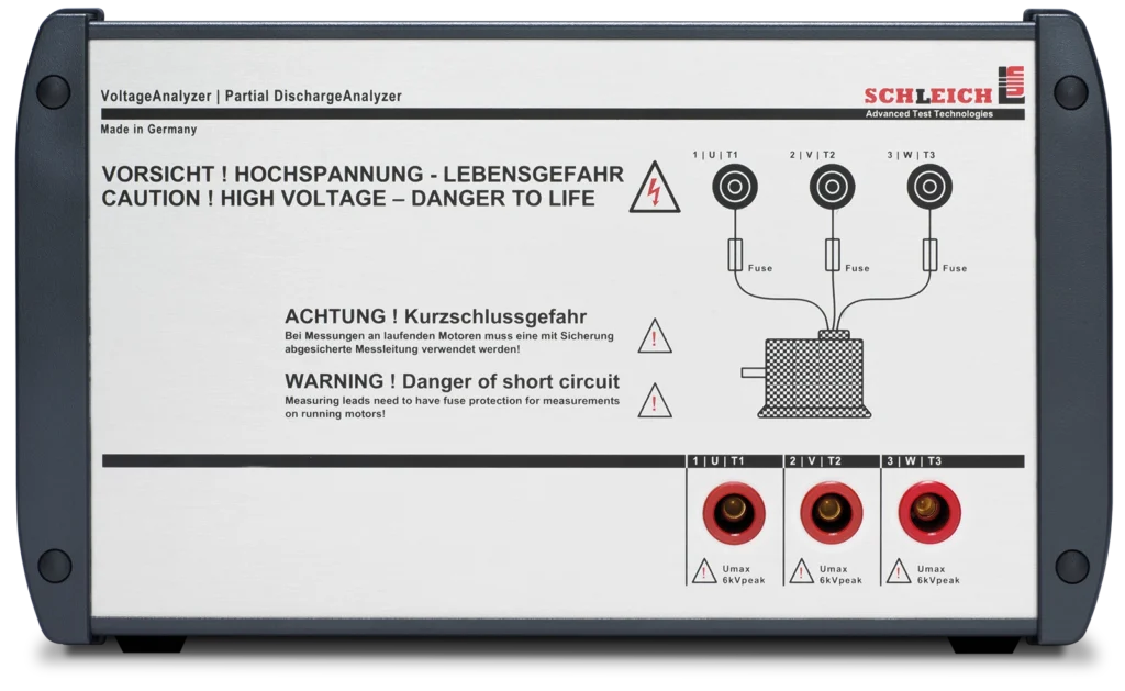 Um einen Drehstrommotor schnell und ohne zeitraubendes Umklemmen prüfen zu können, verfügt der VoltageAnalyzer daher über drei Messanschlüsse. Diese werden über möglichst kurze Messleitungen direkt mit den Klemmen U, V und W des Prüfobjekts verbunden. Die Messstellenumschaltung zwischen den drei Messanschlüssen erfolgt im VoltageAnalyzer vollautomatisch und synchron zur Stoßspannungsprüfung.