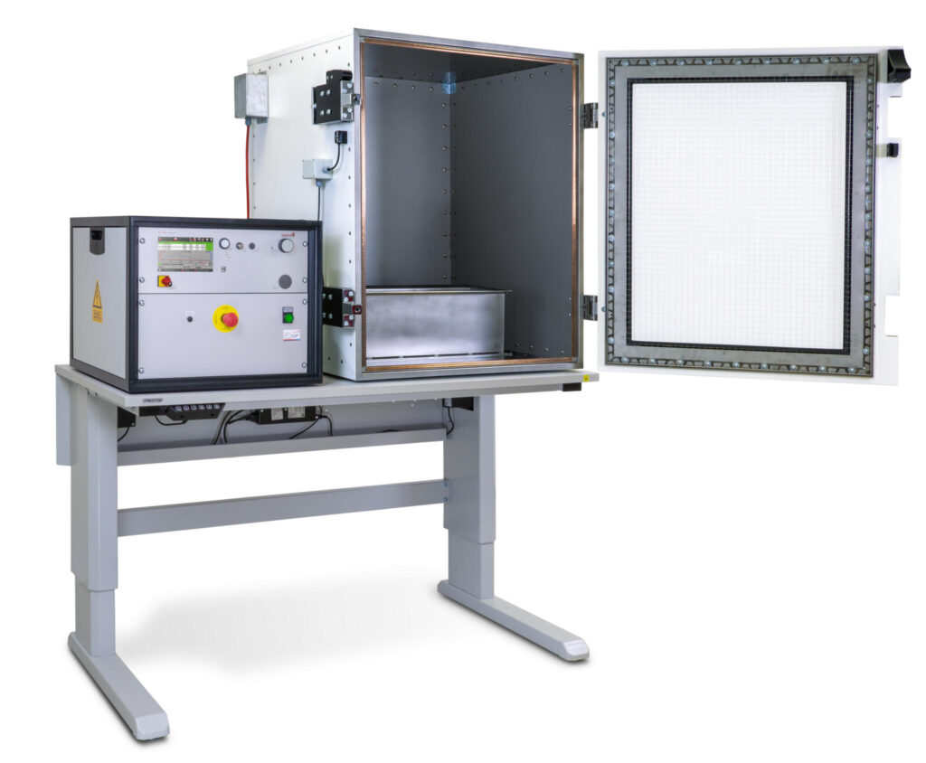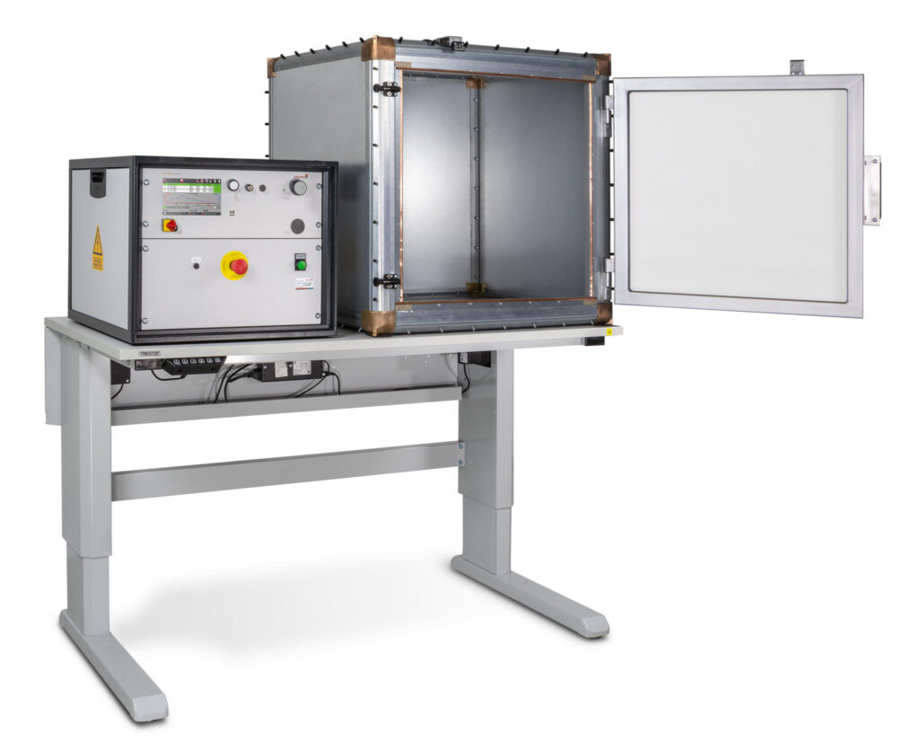 Eine komplette Isolierung verhindert die Spannungsverschleppung nach außen. Das Bedienpersonal ist optimal geschützt. Um empfindliche Prüfobjekte vor elektrostatischer Auf-und Entladung zu schützen sind Prüfkabinen aus ESD-Materialien gegen Aufpreis erhältlich.